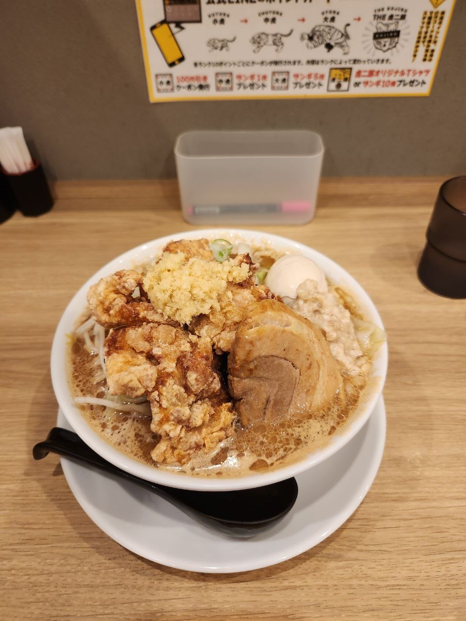 ザンギの乗った二郎系ラーメンのお店。油が濃厚ですが、味わいはどこかさっぱりした感じもありました。ショウガの風味が効いていたのもあったからかもしれません。