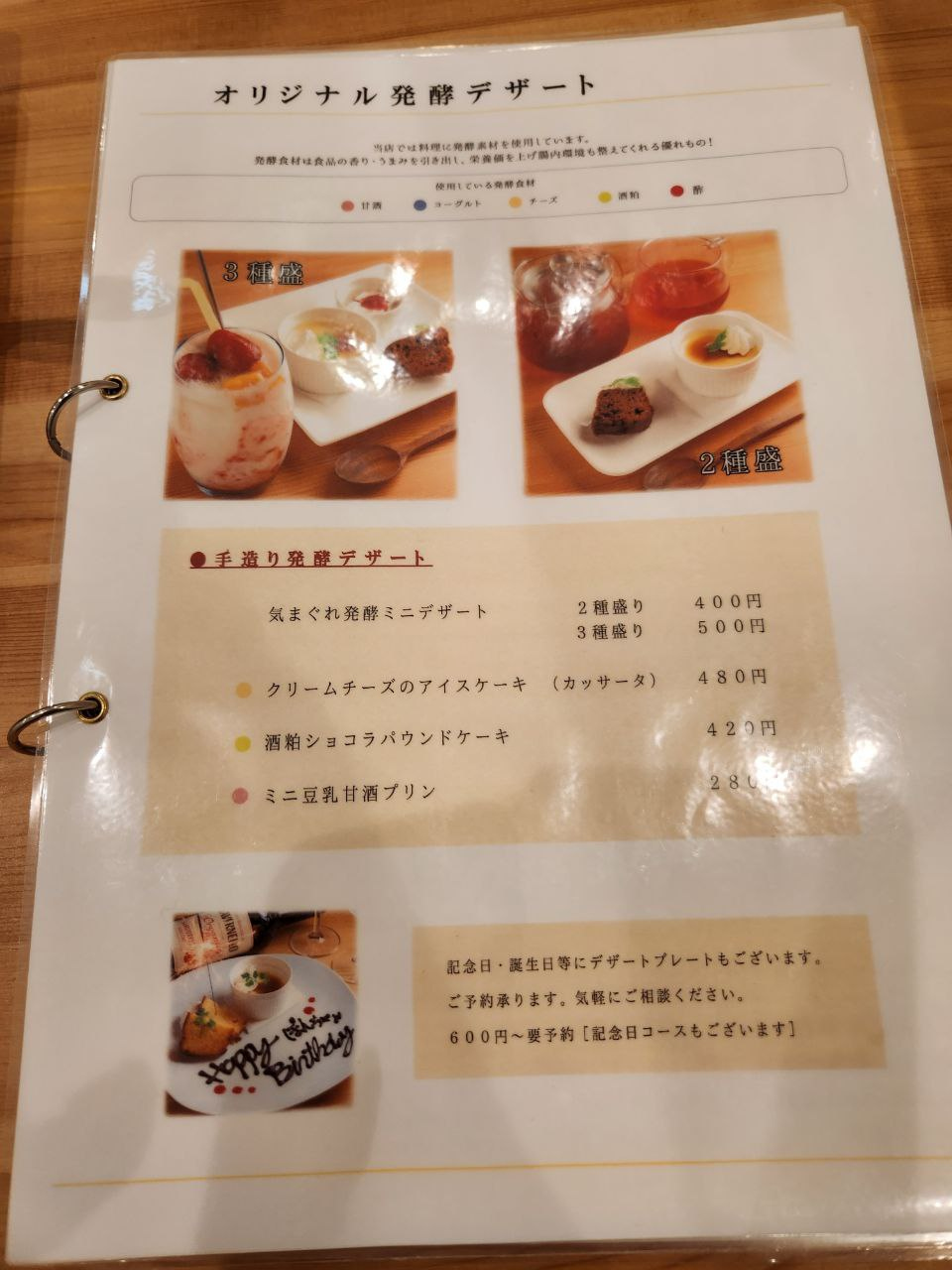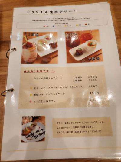 すうぷは和風の味わいがあり、熱々で食べやすい味でした。ごはんも歯ごたえがありもちもちしていました。発酵デザートは、クリームチーズのカタラーナ・酒粕ショコラケーキ・甘酒プリンの3種を注文。プリンは甘酒風味が効いていました。全体的に甘さ控えめ。
