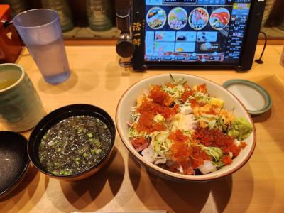 タッチパネルで注文するお寿司屋。ランチタイムは握りや海鮮丼と汁物のセットもあります。バラちらしはまぐろやたこなど、豊富な具材あり。岩のり入りのお味噌汁ともどもおいしかったです。ただ、小食の人にとってはかなりのボリュームに感じます。