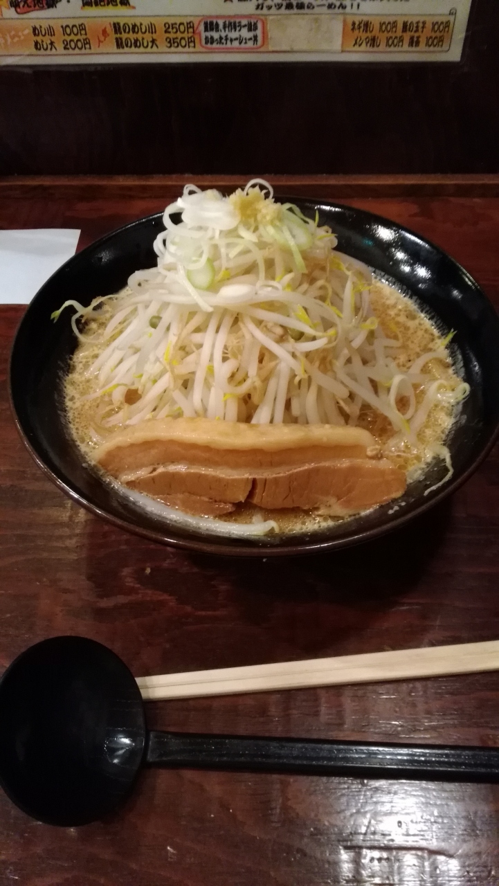 肉魂ラーメンなど、豪快にチャーシューが乗っていたり通常250gのめん大盛だったりとそのボリュームで有名なようです。今回はガッツラーメンみそ味を注文。半量で野菜増しにしたのですが、それでも当方にはかなりのボリュームでした。麺はかなり太めで、もちもちした感じがありました。スープは甘味があり、飲みやすかったと思います。