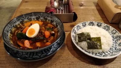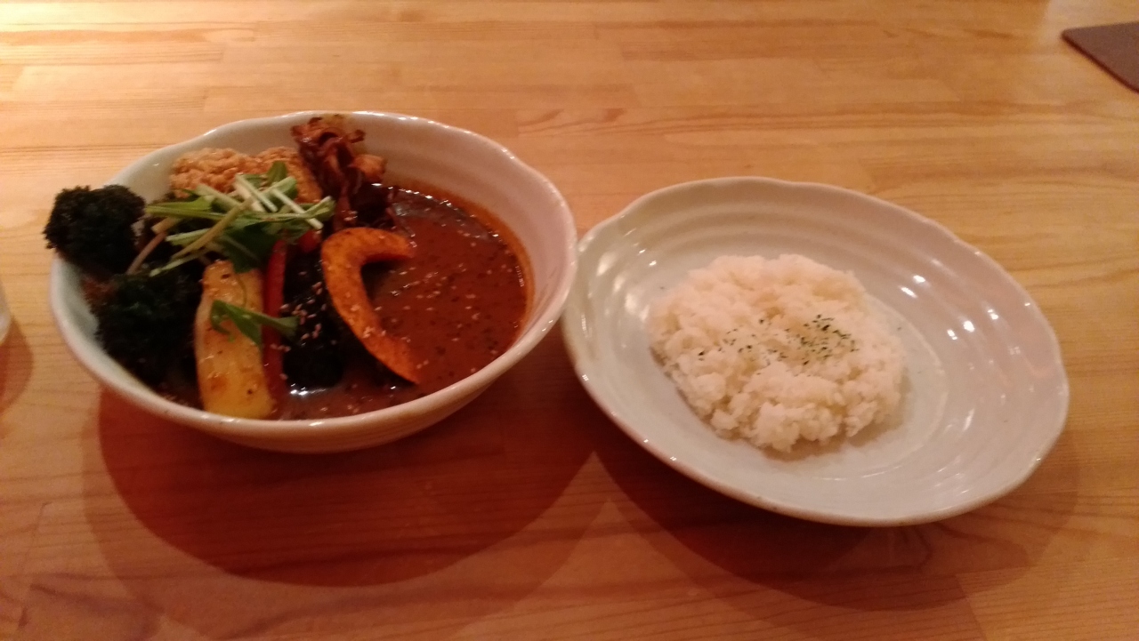 今回は野菜スープカレーを注文。店主の人が注文を受けてから調理を開始します。常連の人もいるようで、和やかな雰囲気でした。小さな虫が店内に飛んでいたのが若干気になりました…。