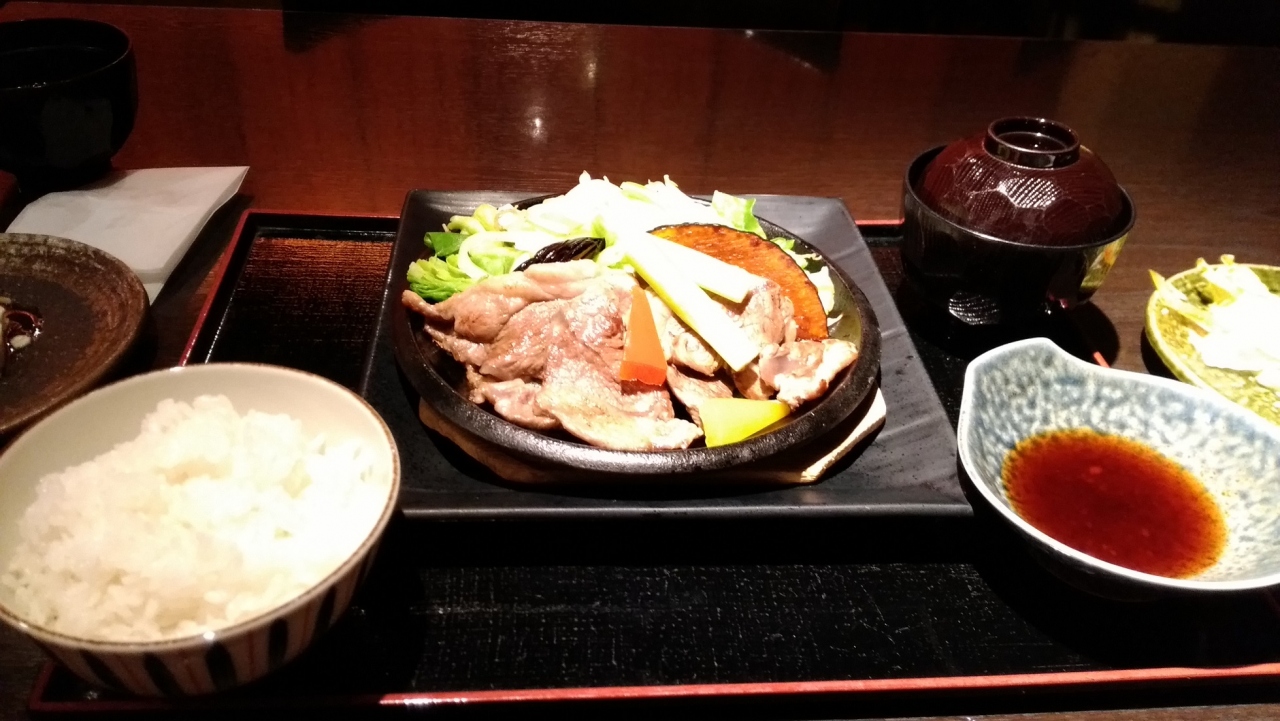 お寿司やそば、和風定食などがある品のある店です。予約なしでも入れました。今回はラム肉と野菜の鉄板焼き定食を注文。メニューは千円を超えるものが多いですが、いずれも惣菜バイキングがセットになります。