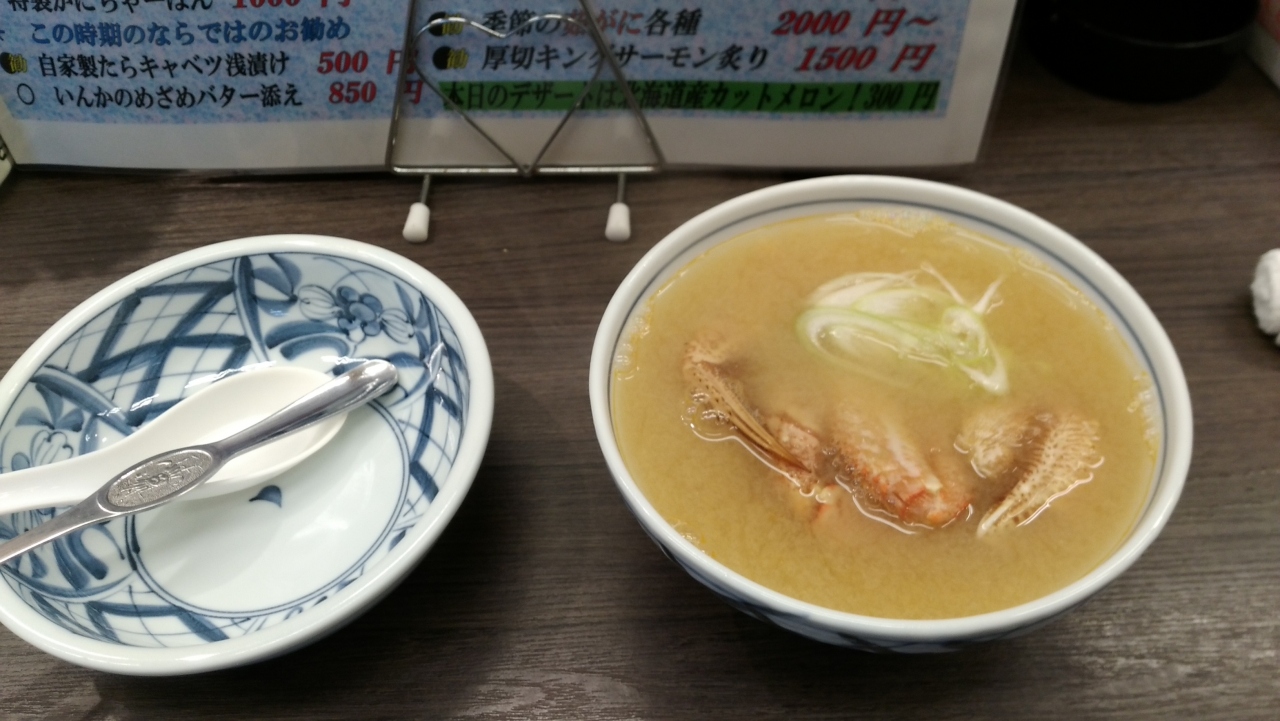 札幌中央卸売市場の徒歩圏にある、蟹卸業のマルサン三上内にある店です。遅い朝食代わりに季節のかに汁を注文。スタッフの人が、お茶を出してくれます。(温・冷)
