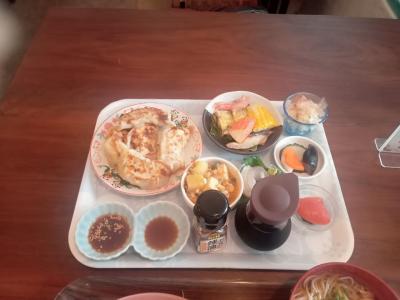 今回は餃子定食を注文。餃子に野菜炒め、お刺身や長芋の小鉢などバラエティ豊かな料理が提供されます。汁物は日替わりだそうで、この日は冷やしそうめんをいただきました。