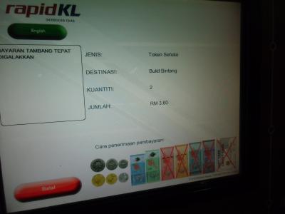 駅の自販機(英語表示あり)でトークン(チケット)を購入して改札口でかざして乗車します。降車時はトークンを改札口へ投入しました。料金は2~3リンギット。