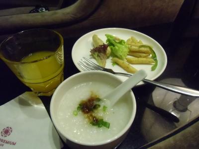 早朝でも思ったよりフードは充実。タイミング悪くスタッフが離席していましたがヌードルステーションもありました。おかゆなどのマレー料理・ソーセージ・サラダ等・パンも数種類。