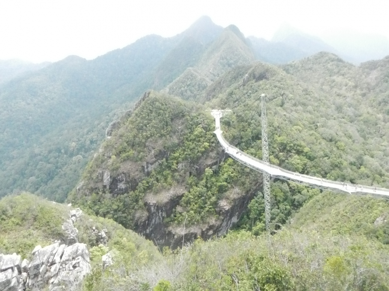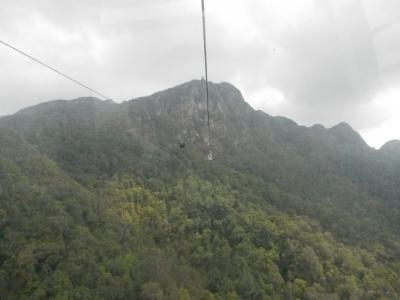 ランカウイ島西部の山にかかるロープウェイとその頂上駅からアクセスするスカイブリッジ。