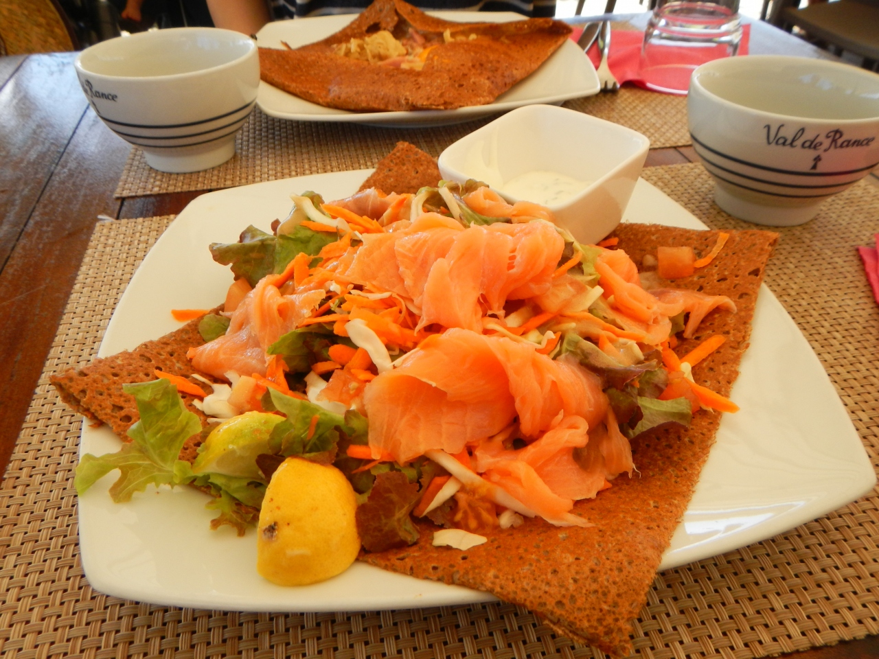 ガレットは種類もいろいろ。シーフードはガレット生地が見えないくらい具が乗っていて大満足。またシードルも爽やかなお味で期待通りでした。