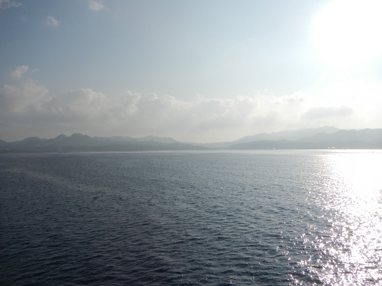 本部港を出た船は高速で伊江島へ。本島北部の八重岳の山々や海洋博公園・備瀬崎などを眺めながら向かいます。