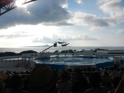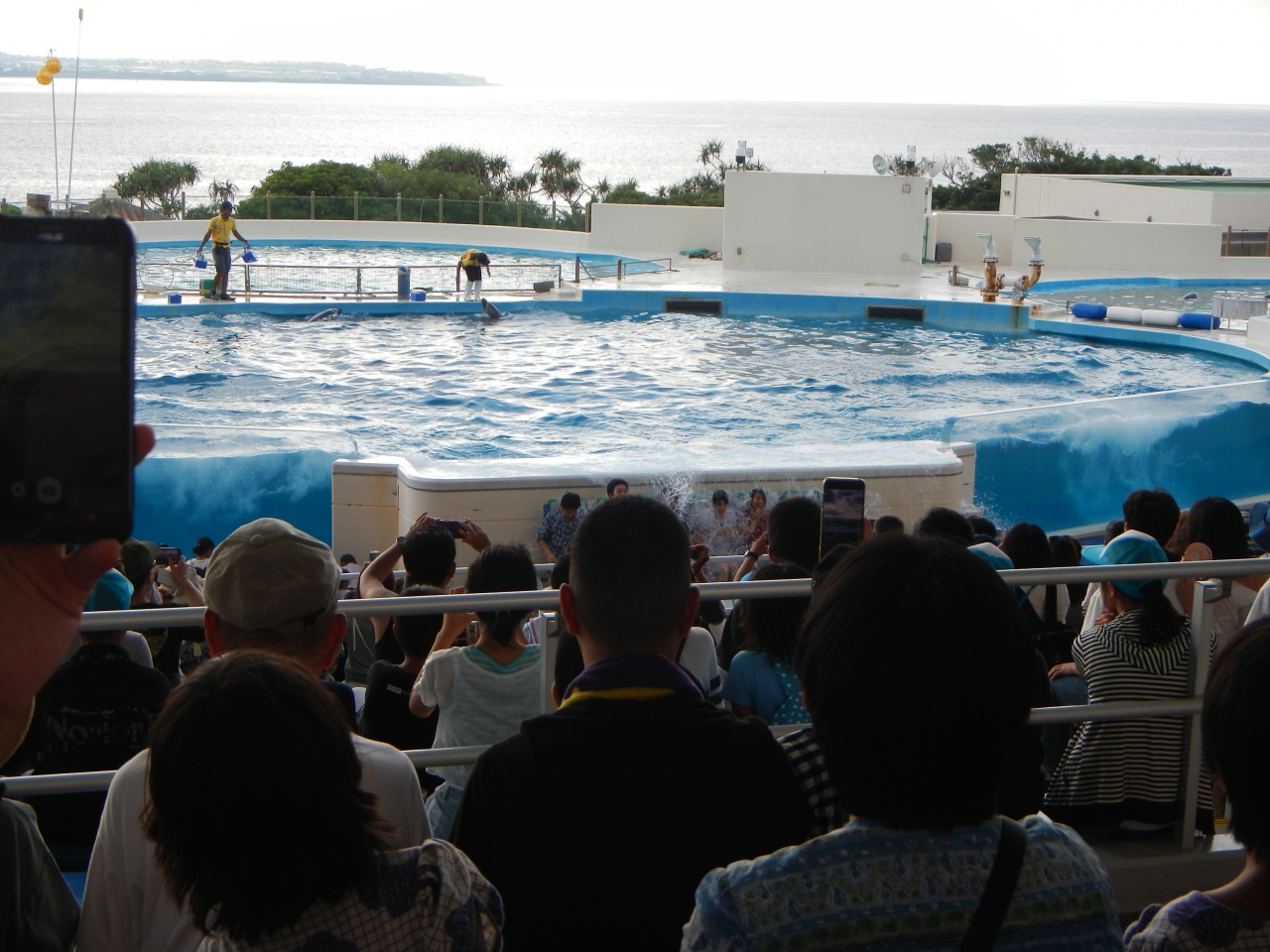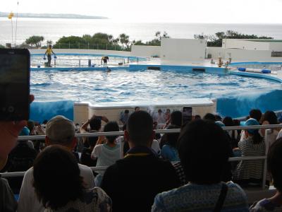 前回美ら海水族館訪問時は時間の関係で見られなかった「オキちゃん劇場」。4月~9月は17:30開演のプログラムがあるということで仙台からの移動初日に訪れました。夕方の海洋博公園は比較的混雑もなく普通に席も確保出来てイルカさんのショーを楽しむことが出来ました。