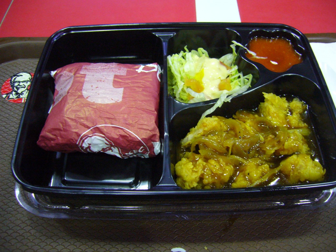 …「焼き」肉ではなく、むしろ「揚げ」肉なんですけれども。フライドチキンにかかっている甘辛いタレ、ご飯が進む味です。