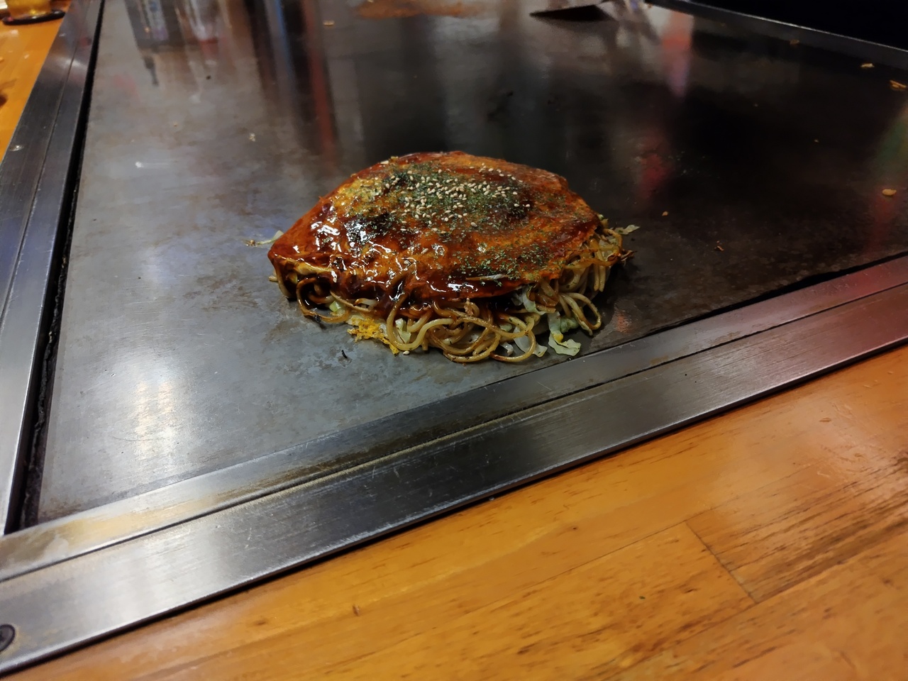 エキニシにある鉄板焼屋さんで人気店。もちろんお好み焼きも食べることができる。名物はこの赤いお好み焼きだ。大きな特徴は、キャベツがざく切りになっており、パプリカのような赤い辛味を入れたソースを塗るのでピリ辛だ。そして肉はホルモン。キャベツがざく切りというのも納得した。美味しいお好み焼きの派生だ。