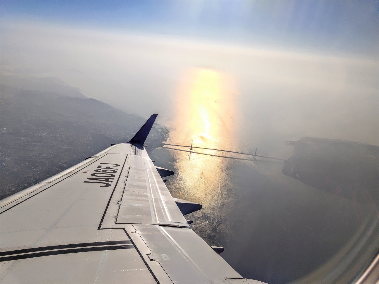 明石海峡大橋は神戸の舞子から淡路島に架けられたつり橋で、その姿のも美しい。お勧めなビュースポットは、意外かもしれないが、飛行機の中から。神戸空港を利用する場合、風向きにもよるが、明石海峡大橋の上空を通るのでその時によく見える。