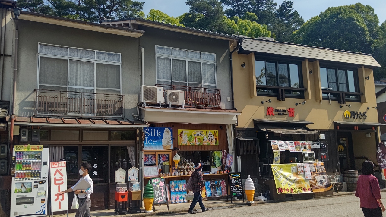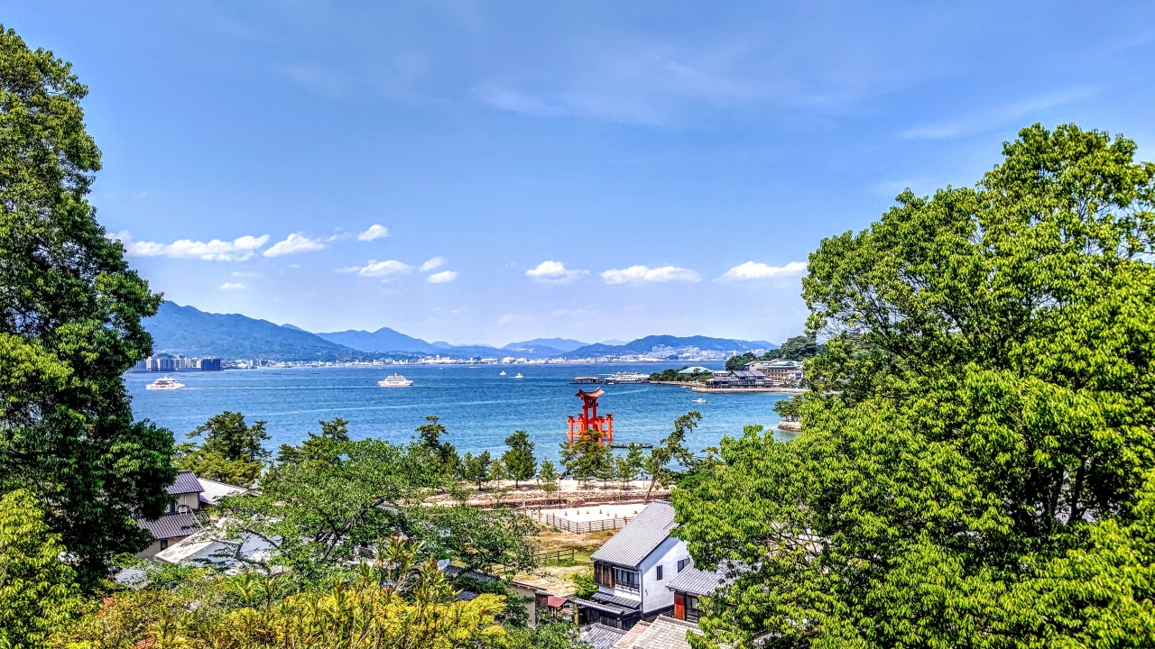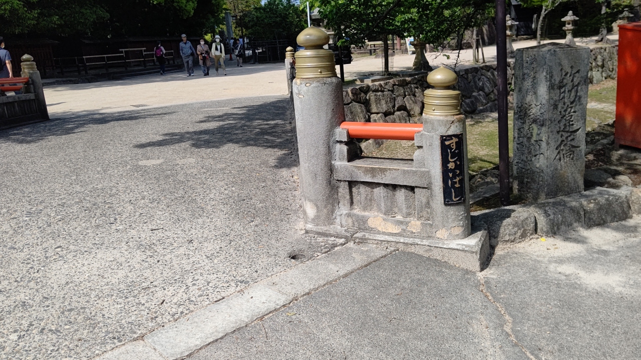 宮島口からフェリーで10分程、宮島桟橋に到着して最初におとずれるばしょが、桟橋目の前の広場だ。多くのツアーの人たちが体制を整えるための広場と言ってもよい。広場はロータリーになっており、ロータリーの先には商店もあるので、軽い食事もできる。