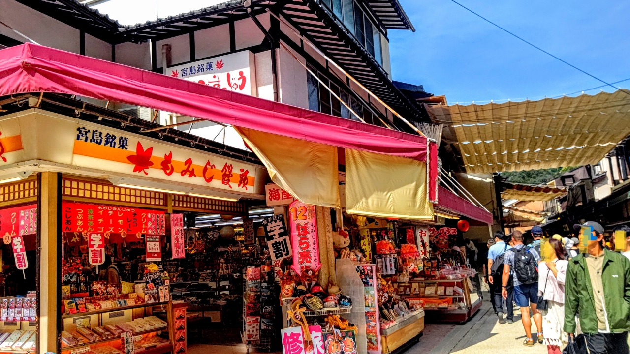 厳島の観光後、桟橋まで戻るのであれば断然表参道商店街を通ることをおすすめする。多くの店が軒をつらね、多くの人でごった返す通りはお土産を買う際に悩んでしまう。食べ歩きのできるようなお菓子も多く販売しているのも嬉しい