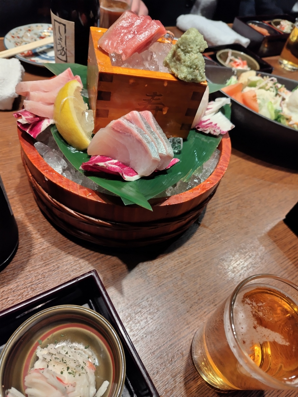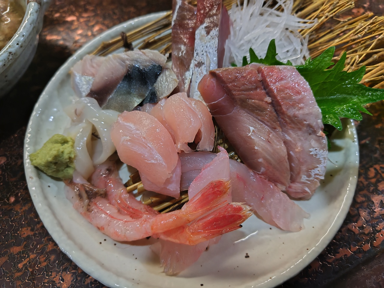 お店はカツオの刺し身と刺身の盛り合わせがおすすめ。盛り合わせはタイが盛られ豪華絢爛。カツオはにんにくなど薬味がついているので合わせて食べてみよう- 旅行時期
