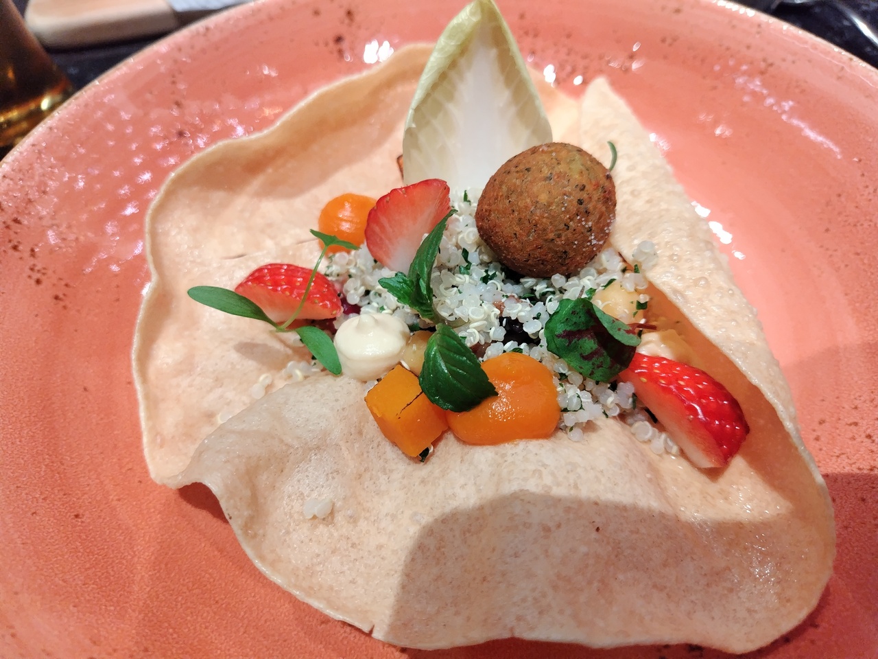 ヒルトン大阪の2階にあるレストランで食事をしたが、上品な味でとても満足行くものだった。スターターのコロッケとこれにつけるソースはヨーロッパで食べたことの味付け。なかなか日本では味わえない。そして斬新なひよこ豆のサラダやオマール海老、メインのヒレ肉も絶品だ