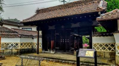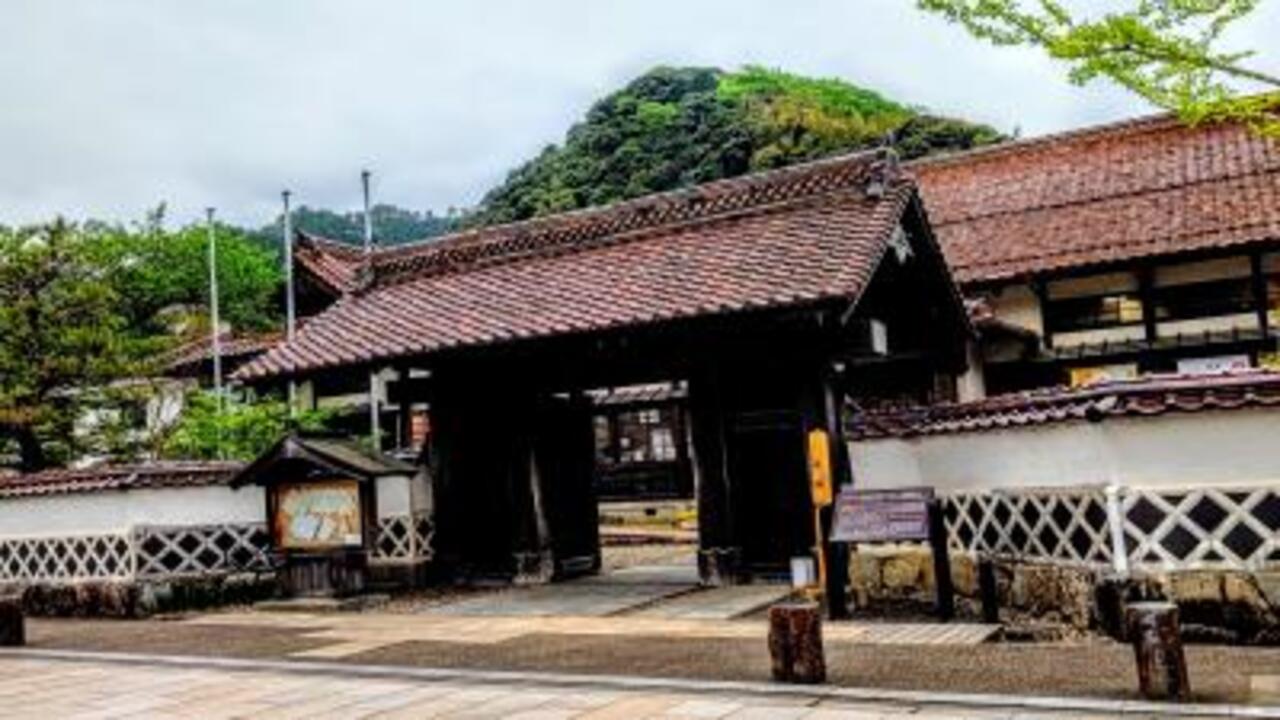 津和野伝統的建造物保存地区にひときわ立派な門があるが、それは津和野藩の亀井家を支えた大岡家の武家屋敷の家老門だ。奥に見えるのが役場だが、役場の一部となっている。石州瓦があしらわれ門の大きさが大岡家の家格の高さをうかがえる。