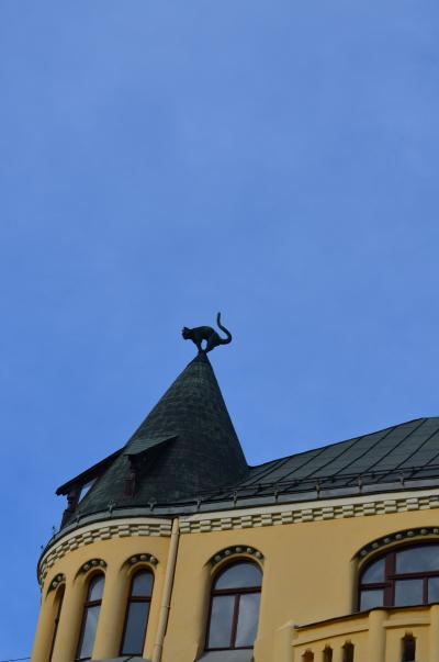 リーガの旧市街に位置し、便利の良い場所にある。建物の円柱の屋根のてっぺんに一匹の猫が見える。以前は逆を向いていたそうで、裕福なラトビア人が住んでいたそうだ。ドイツ人が締めるギルトに加入したかったが、ドイツ人ではない彼はギルトに加入できなかった。それでこの猫をギルトの方向におしりを向けたのだそうだ。かわいらしい猫なので、一見の価値あり。