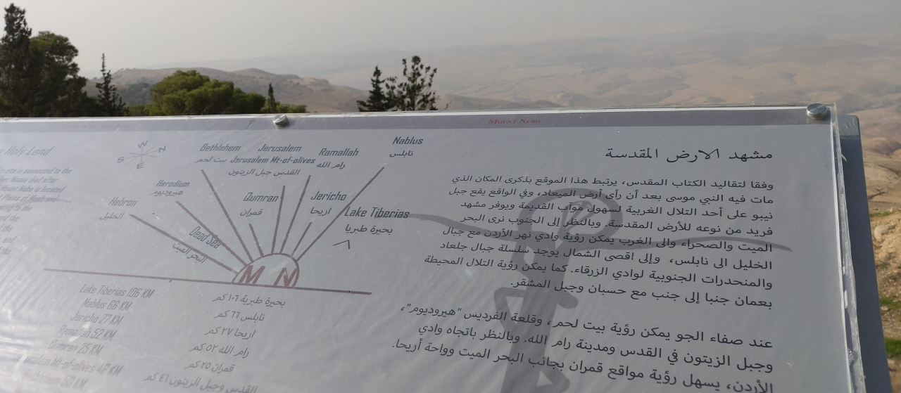 「ネボ山」は死海にほど近く、標高が約820メートルあるとのことです。旧約聖書では、預言者モーセは、このネボ山の頂上から 約束の地カナンをのぞみ見、しかもその地に行くことが許されず、120歳でこの地で終焉をむかえました。岩や砂のみの荒涼とした景色がひろがり、エルサレムも遠望できる「ネボ山」からの景色に、魅惑を感じざるを得ません。