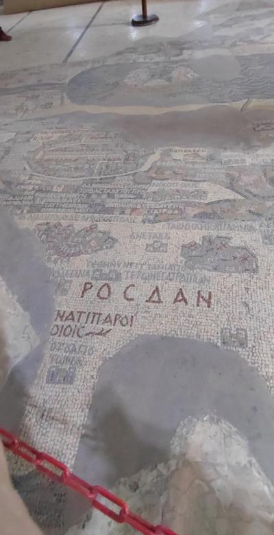 ギリシャ正教の教会で、「マダバ地図」と言われる、モザイクでできた世界最古の地図があります。地図は床にあり、間近で見れます。ビザンチン時代の、パレスチナ周辺の地図とのことで、エルサレムを中心に正確に表現されています。死海も描かれていて、魚が死海から逃げる様子が面白いです。広大な範囲をこれほどまでに正確にあらわしていることに感心しました。