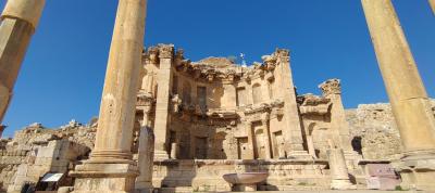 「ジェラシュ遺跡」の中ほど「大聖堂」の近くに「ニンファエウム」はありました。191年に建てられたそうで、泉の妖精「ニンフ」に捧げられたとのことです。半円形の建築は壮麗で見ごたえがあります。正面には水盤がありました。