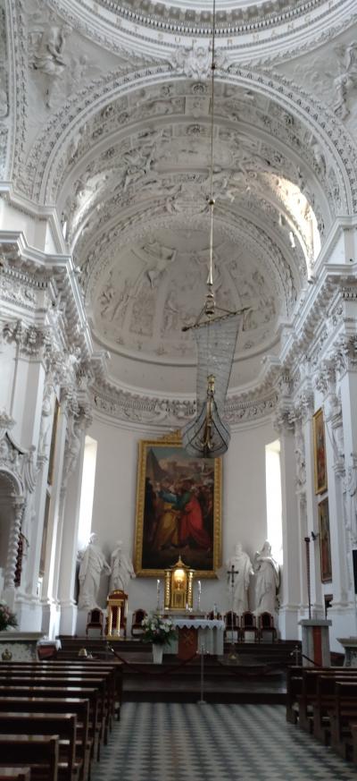 旧市街から少し離れたところにあります。教会の外壁はクリームイエローですが、中に入ると、真っ白で素晴らしい漆喰彫刻の世界が広がっています。2000以上の彫刻があるそうで、その迫力に圧倒されます。いくらかの寄付をすると、教会のパンフレットをもらえます。