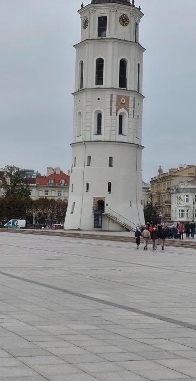 大聖堂の前隣に立っています。色は白く、高さは53メートルあるそうです。位置的にも非常に目立つ美しい鐘楼です。鐘楼前には「Stebuklas」と書かれたタイルがあり、バルト三国の人々が、ソ連からの独立を求めて手をつないだ「人間の鎖」の出発点だと、ガイドさんから説明がありました。