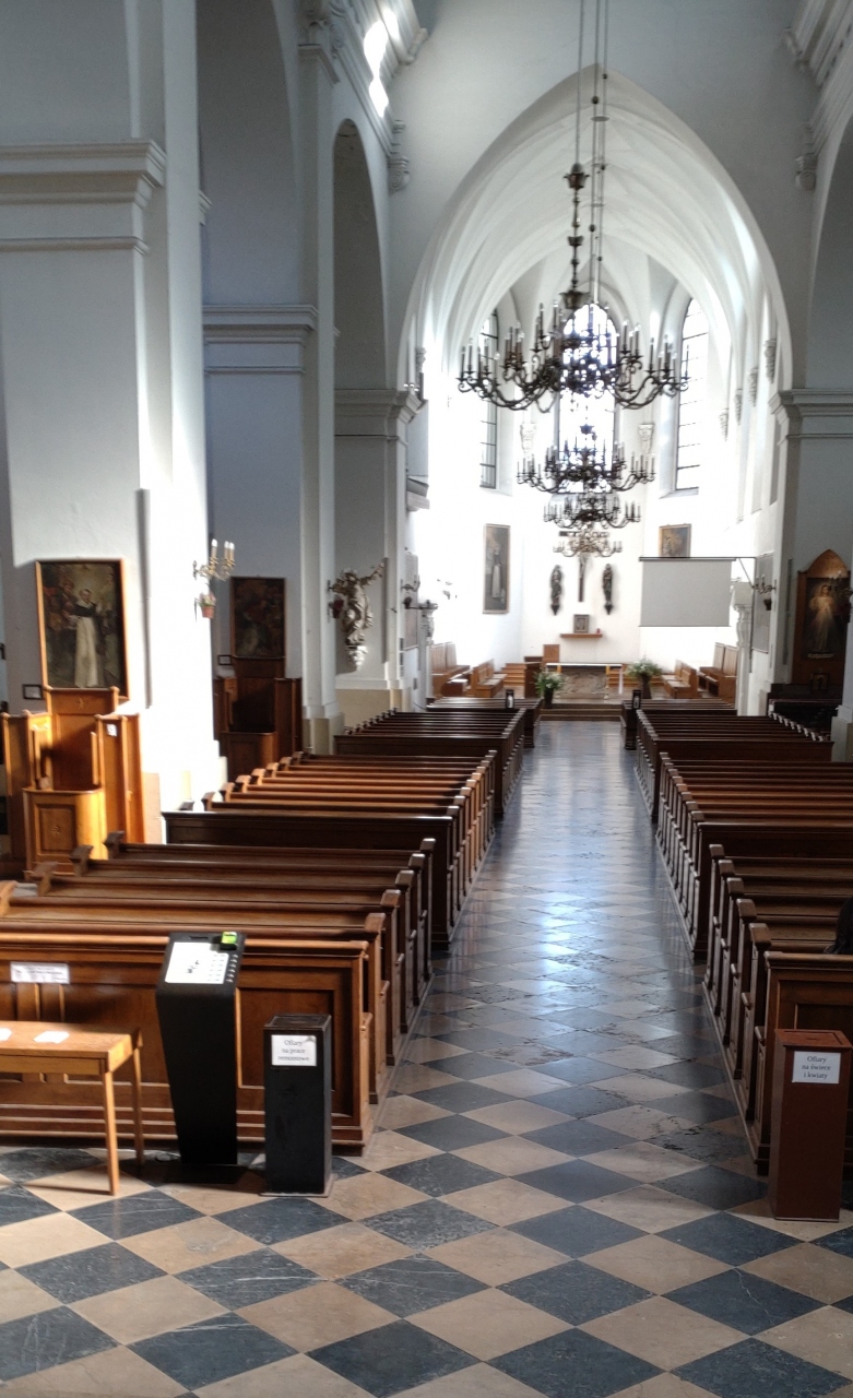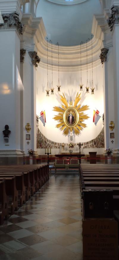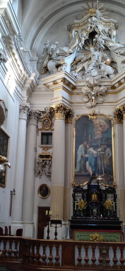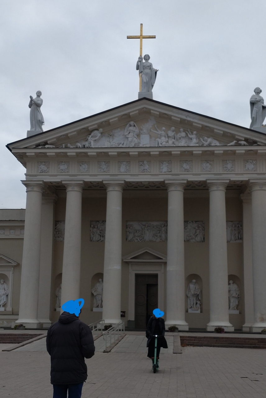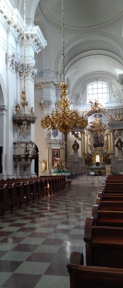 ギリシャ神殿のような柱の 白さが際立つ存在感のある大きい建物でした。大聖堂の内部にある「聖カジミエルの礼拝所」には、リトアニアの守護聖人「カジミエラス」の遺骸が安置されています。17世紀バロック様式の装飾で 荘厳な感じを受けました。礼拝所正面の「聖カジミエルの聖画」については、3つ目の手を画家が誤って描いてしまい、何度消しても現れるといわれているそうです。