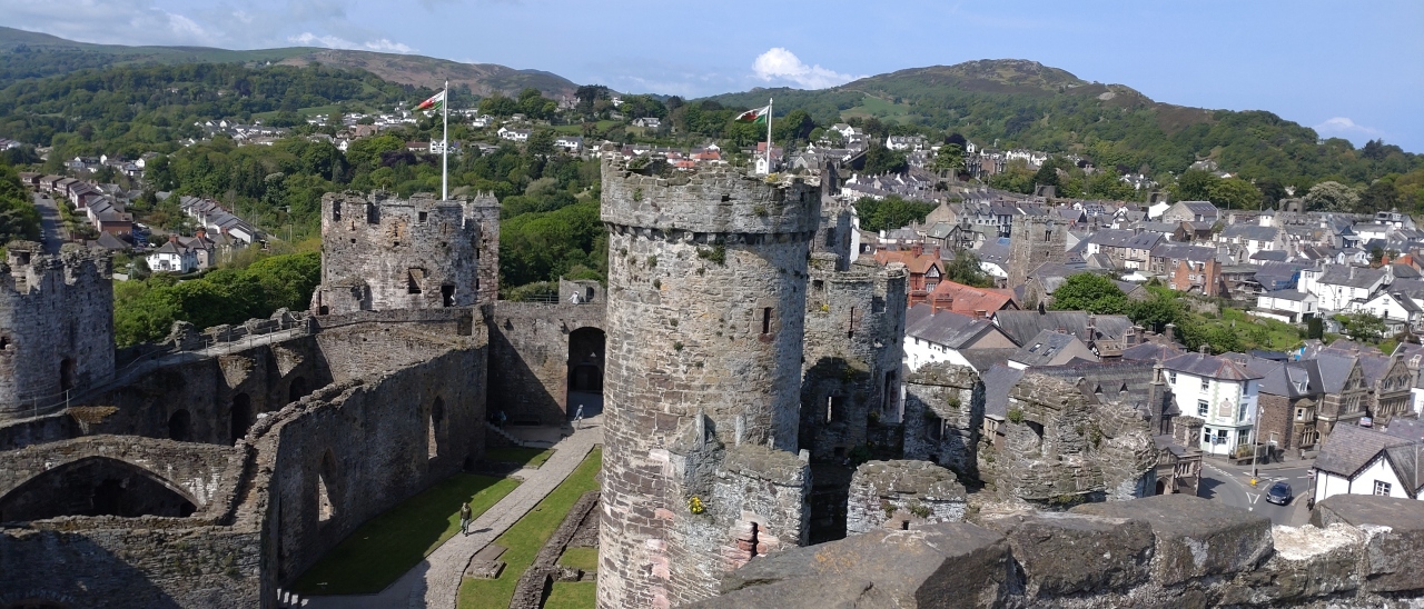 イングランド王エドワード1世によって1283年から1287年に建てられました。コンフィ川と背後の山地が自然の防御壁になっていて、ウェールズ遠征の軍事拠点となりました。城壁に連なる8基の高い塔など、力強いたたずまいをしています。塔の上からの眺めもすばらしいです。コンウィ城は日本の姫路城と姉妹城提携を結んでいるそうです。