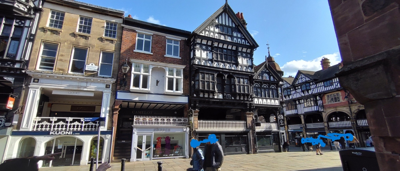 旧市街の中心の「ザ・クロス」付近には、白壁に黒い木組みのチューダー様式の木骨造の家屋がたくさん並んでいます。建物は、2階部分に「ザ・ロウズ」と呼ばれる屋根付きのにアーケードのように繋がっています。雨にぬれずに買い物を楽しめるためのものだそうです。