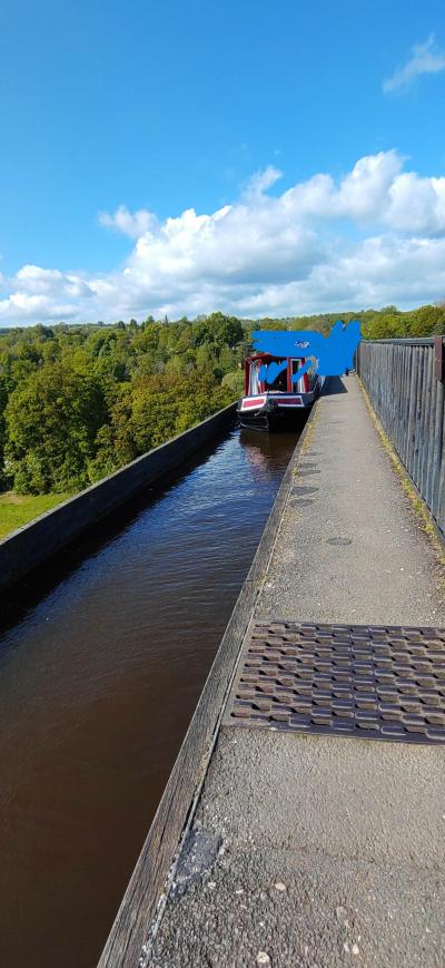 「ディー川」の上に架かる水道橋と運河です。2009年にユネスコ世界遺産に登録されました。「ナローボート」と呼ばれる幅の狭い船が水路を行き来しています。水路に沿って歩けますが、狭いです。水道橋は高さ38m、全長307m、深さ1.6mです。晴れてて良かった~!片側に手すりはありますが、もう片方は水路そのものです。