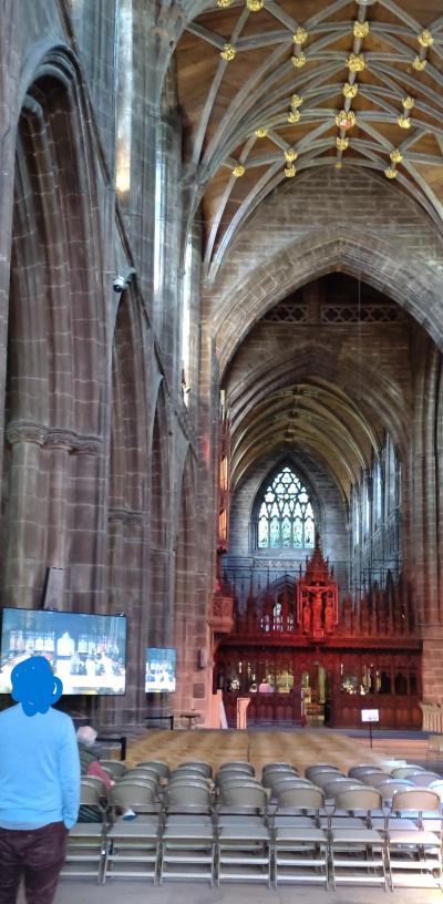 「チェスター大聖堂」は約2000年の歴史があるという、城壁の街「チェスター」のシンボル的存在です。長い歴史の中で、ノルマン様式、ゴシック様式など、いろんな様式が入り混じる建物になったそうです。建物は、新赤色砂岩で作られており、威厳のある素晴らしい建物でした。素晴らしい内部に見とれて、出口がわからなく迷子状態になりました。