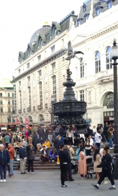 サーカスは、複数の道が交わるところにある円形の広場のことですが、「ピカデリーサーカス」は円形ではありませんが複数の通りの起点となっています。中心のシャフツベリー伯記念噴水の階段には多くの人が腰を掛け憩っています。噴水上部の「エロス像」は、ギリシャ神話の愛の神「エロス」ではなく、双子の弟の「アンテロス」をイメージしたものだそうです。