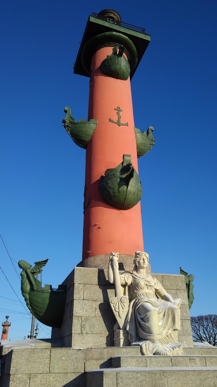 ピョートル21年のロシアの海戦の勝利を記念して建てられた高さが約32メートルのモニュメントで、ワシーリエフスキー島の岬にあります。赤い柱に船首の飾りが独特の雰囲気を醸し出しています。灯台柱は2本あり、近くにはエルミタージュ美術館や、ペトロパヴロフスク要塞などがあります。サンクトベテルブルク観光中に何度も見ることができました。