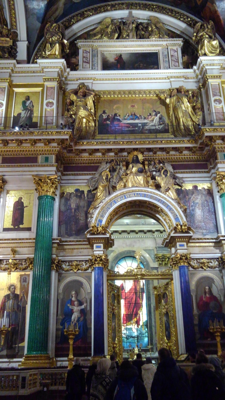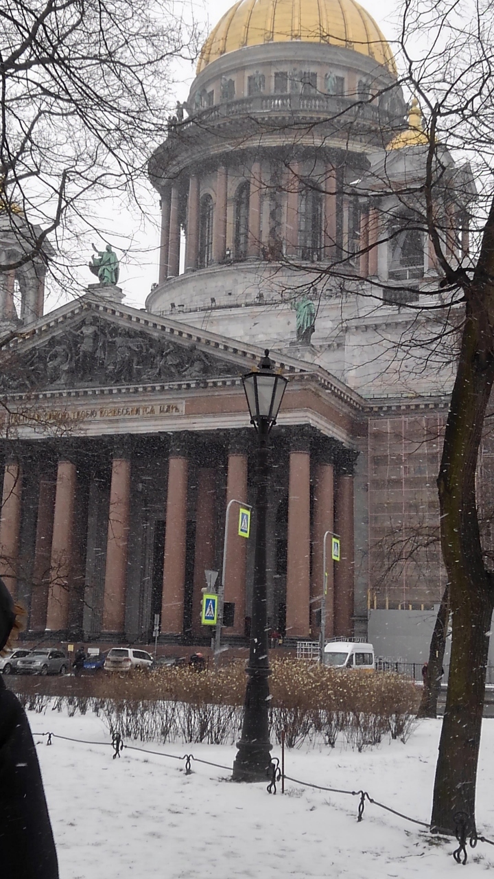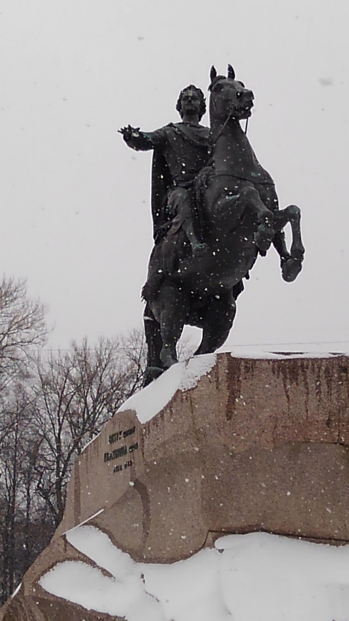 聖イサク大聖堂に行く前に立ち寄りました。どのように感慨深いものかと楽しみにしていましたが、サンクトペテルブルクの冬の前では、しばらく眺め写真を撮るだけに終わりました。像はネヴァ川の方を向き、巨大な石の台座の上で後ろ足で立ち上がる馬にピョートル大帝がまたがっているものです。躍動感と大きさはすごいですね。プロイセン出身の女帝エカテリーナがピョートル大帝の後継者であることを示すために造ったと言われています。
