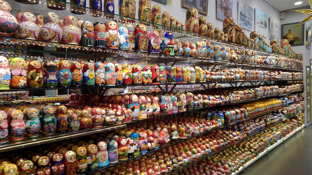 芸術広場近くにあるお土産屋さんです。マトリョーシカの数は半端ない。琥珀のアクセサリーや毛皮の帽子、食品まで様々な商品がありました。もちろん歴代大統領のマトリョーシカ もありました。あまりかわいくないけどね~ 外観は落ち着いた黄色で高級感があふれています。お値段もかなり高め。ウオッカの試飲もありました~。うめぇ~!!
