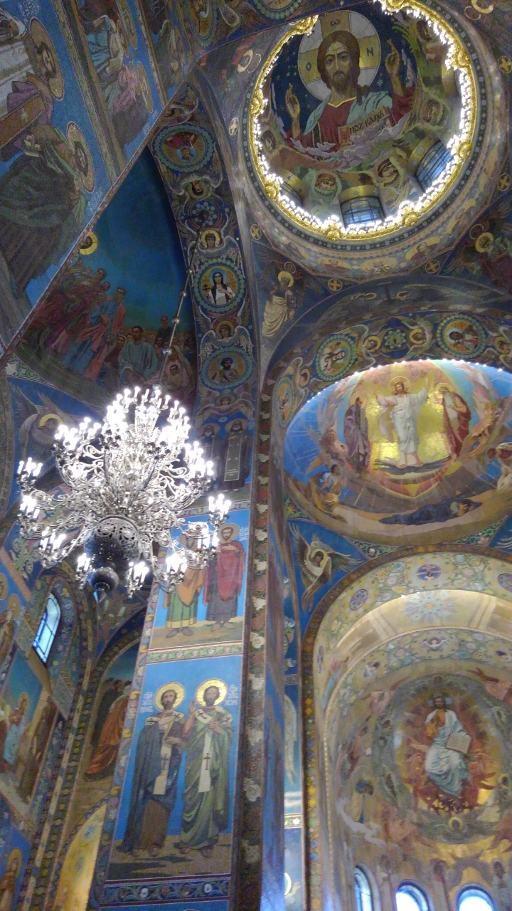 「血の上の教会」と心にとめておいた教会の正式名称が「ハリストス復活大聖堂」でした。1881年にアレクサンドル2世が暗殺された場所に息子が建てたことからこのように呼ばれたそうです。アレクサンドル2世は農奴解放を初めとする大改革を敢行したそうです。一際目を引く玉ねぎ形のドームの教会の内部は、素晴らしいモザイク画に彩られ深い感銘に包まれました。