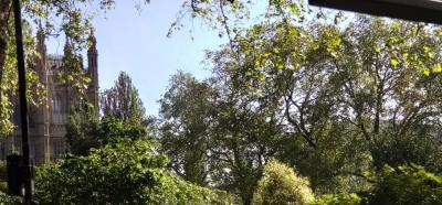 「ビクトリアタワー」は、ウェストミンスター宮殿の南西端にある高さ98.5メートル四角い塔です。その名の通り「ビクトリアタワー」のある庭園として、素晴らしい景色を作っています。「ランベス橋」はすぐそばにあります。「ビクトリアタワー」の上のユニオンフラッグは王宮の君主の在席を表していると、ガイドさんは言ったような・・・。