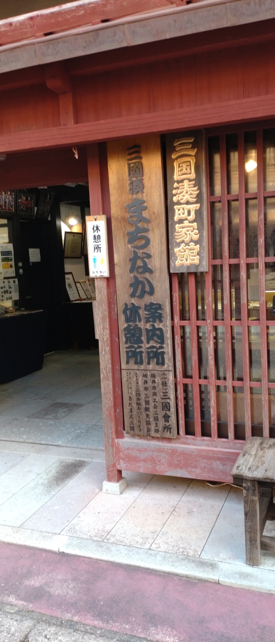 「三国湊きたまえ通り」に面してあります。お隣は「旧岸名家」。近くには「旧森田銀行本店」など見どころ多い一角にある観光案内所です。その建物も旧商家を改築したもので、ベンガラに格子戸と味わいがあります。駐車場の場所をお聞きし、散策MAPをいただきました。街歩きの拠点となります。