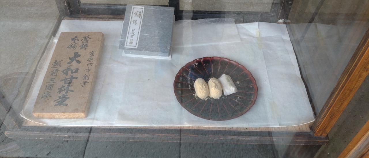 三国湊町の街歩きで立ち寄りました。創業は亨保4年の約280年前という老舗と言うことに驚かさせられました。「鴬餅」が看板商品で、お菓子の誕生にも”三国湊”とともに歴史があるようです。お店も、古き時代を思わせる建物でした。
