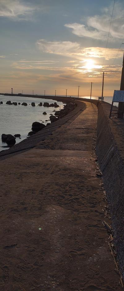 ”エッセル堤”とも呼ばれる三国港突堤は、「サンセットビーチ」にある「三国温泉ゆあぽ~と」の裏手から日本海にのびています。長さ511メートルの突堤が夕日が沈む海に続く景色は幻想的ですばらしかったです。夕日の鑑賞の方もおられましたが、釣りを楽しんでいらっしゃる方が多かったです。国重要文化財です。