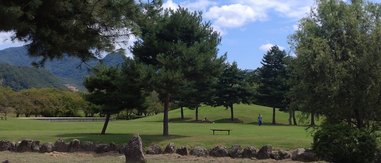 武田信玄と上杉謙信の戦いで有名な川中島古戦場跡にある公園です。緑の芝生が広々と広がっています。遊具やベンチ・かやぶき屋根の東屋があり、ゆっくりくつろげます。八幡社へむかう道沿いに、果物がお安く売られていて、果物好きな私のはとても気になりました。
