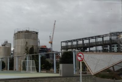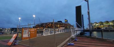船が通る時だけ、橋が跳ね上がる 開閉式の可動橋と聞いていました。「ヴァイアダクト・ハーバー」から「ウィンヤード・クウォーター」へ行くのに見学方々利用を考えていました。橋の手前に来ると、橋は二つに割れて跳ね上がった状態で、入口はしっかり閉鎖されていました。