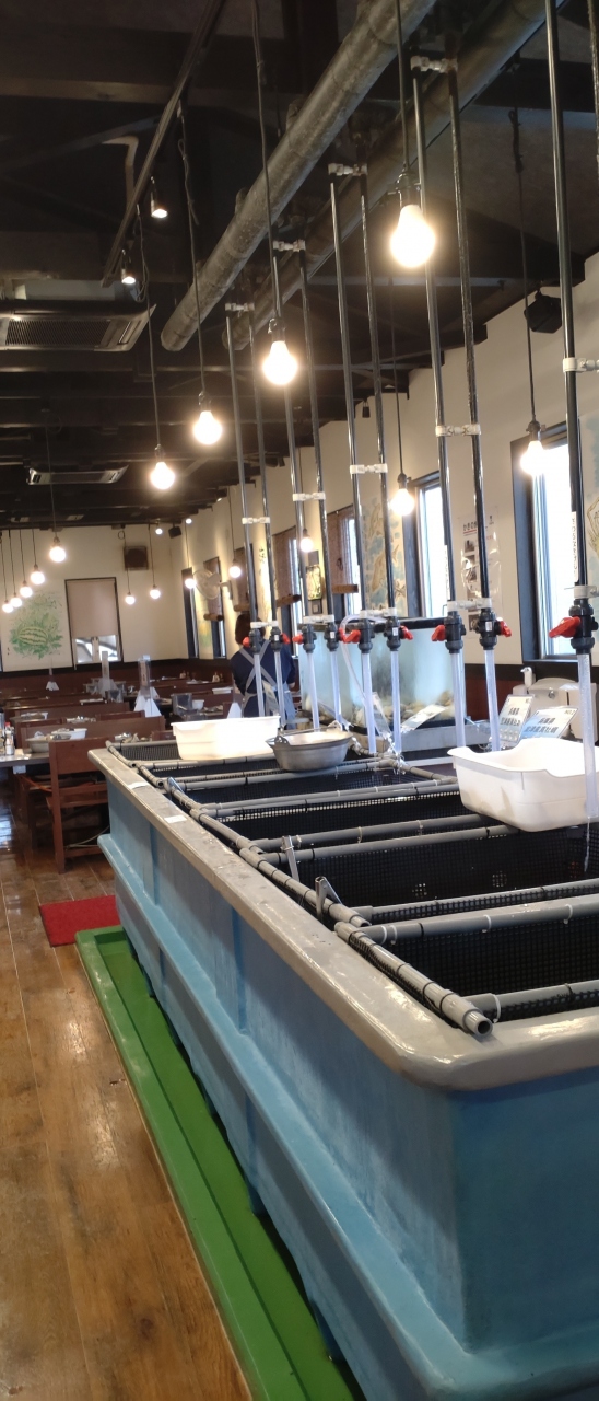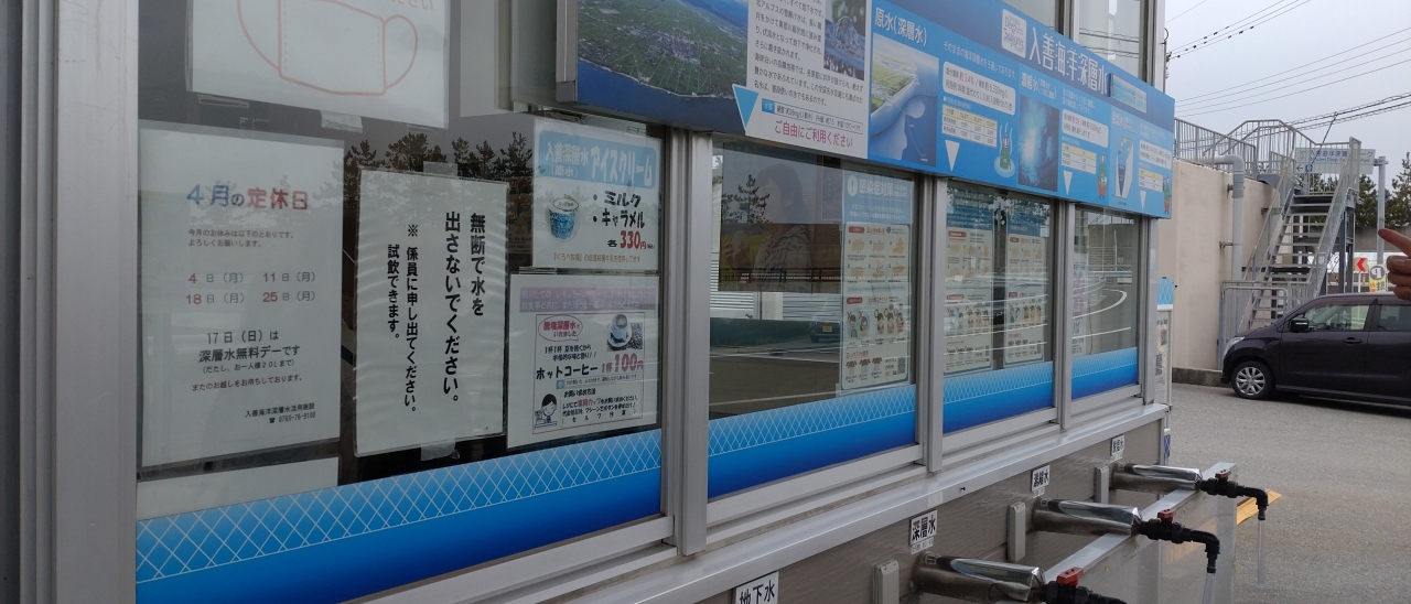 富山県入善町「入善・深層水パーク」の中にありました。そこでは、活用施設の小口分水設備として深層水の購入ができます。「濃縮水」「脱塩水」とおまけの「地下水」の蛇口が並んでいます。紙コップが設置されていて試飲ができるほか、大小のペットボトルも販売されています。深層水は辛く、カルシウムやマグネシウムなどのミネラルがバランスよく含まれているため 料理に使うと仕上がりがいいとのことです。