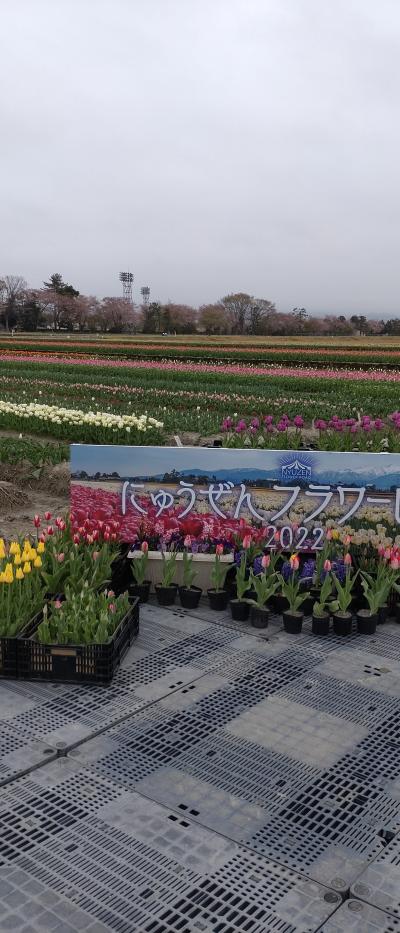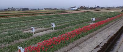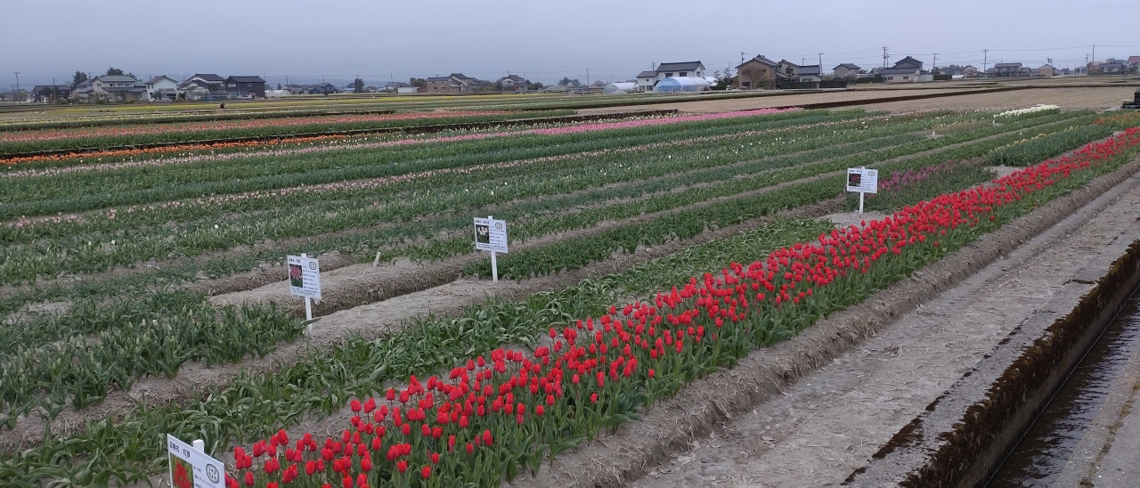 富山県のチューリップ球根の産出額は全国1位とのことで、入善でも多くの花が育てられています。その農家の畑を鑑賞させていただくとのことで、このイベントがあるそうです。畑の土を踏むと、土が押しつぶされ、一体のチューリップがダメになるそうで、周りを散策、畑へは入ってはいけません。訪問時はちょっと早かったみたいですが、即売所もあり楽しむことができました。