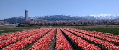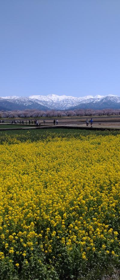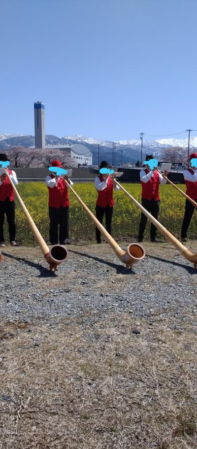 富山県朝日町では 残雪の朝日岳を背景に、舟川の桜並木、菜の花、チューリップで四重奏が奏でられるとのことですが、なかなか一時期にはそろわないとのことです。訪問時は 桜は5分咲き、チューリップは一部畑は満開、菜の花も一部畑が7部咲きといったところ、そろえて撮るには三重奏が限界でした。地元のホルンクラブの演奏やお土産屋さんも出て観光客でにぎわっていました。訪問は 少し遅めがいいかもしれません。