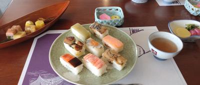 「ますのすし手作り体験」に挑戦しました。笹を隙間なく並べたり、マスの並べ方など美味しく作るポイントを教えてもらいました。サイズは小さいものでした。工場見学や DVD モニターによる説明で「ますのすし」の歴史等もがわかりました。立派な建物でした。