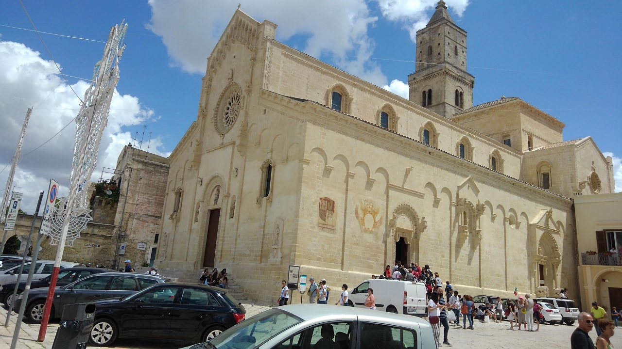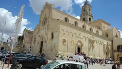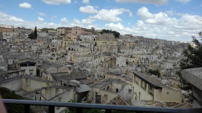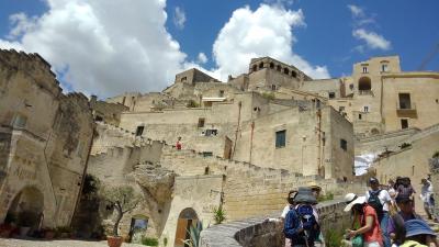 「マテーラの洞窟住居と岩窟教会公園」は、1993年に登録された世界遺産です。渓谷の岩盤に連なるサッシと呼ばれる洞窟住居群は 独特の景観を作り出しています。住居の壁となっている岩盤は非常にもろく ガイドが手ではぎ取って見せてくれました。ビックリです。訪問時は 照りつける太陽と 坂道や階段の昇降で 少しばかり体力が必要でした。一部の住居は見学できましたが、ホテルやお土産屋でも洞窟感を味わえました。