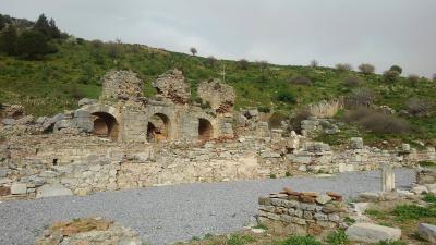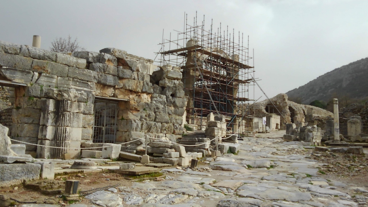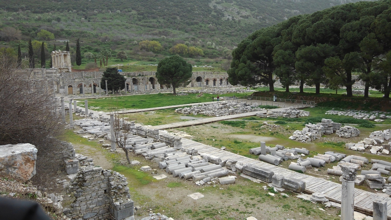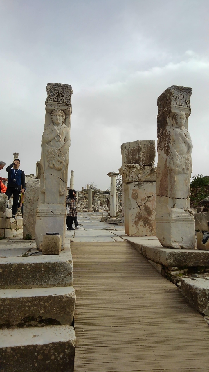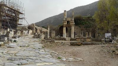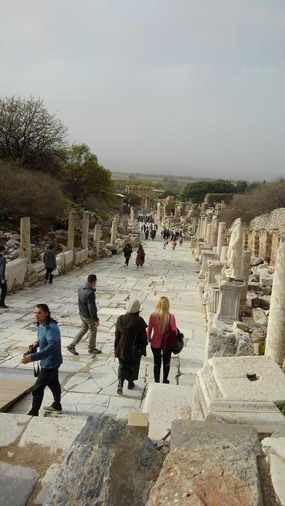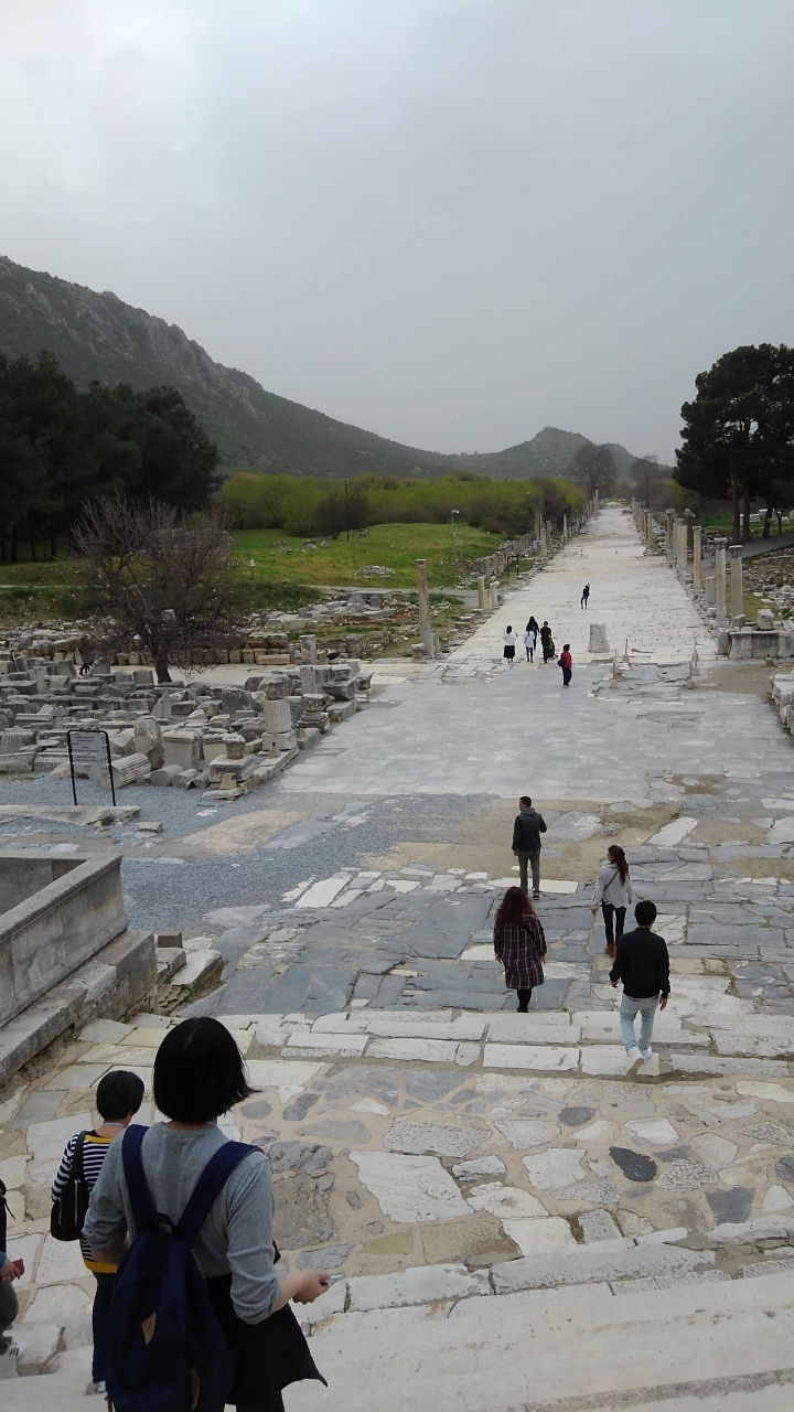 トルコのエフェス遺跡にあります。大劇場から続く通りです。昔はすぐそばまで海があり、港に続いていたそうです。かつては 道の両脇には商店が並び賑わい、夜には柱に灯がともされていたそうです。アントニウスとクレオパトラもこの道を歩いた立派な通りです。